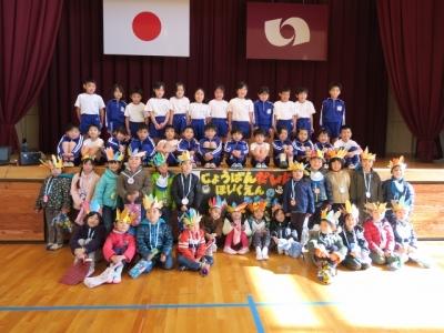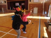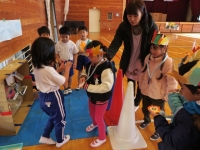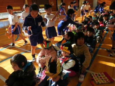 まずは、生活科の学習で作った葉っぱのおめんをかぶり、歓迎のダンス。