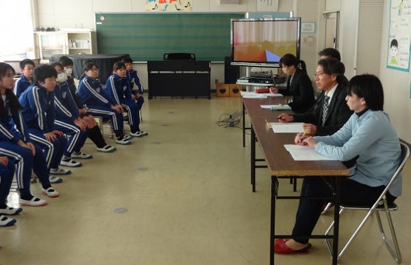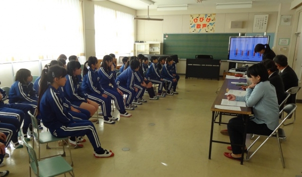 次に、本校養護教諭から本校の健康に関する実態の報告がありました。子どもたちは、身を乗り出してその報告を聞いていました。