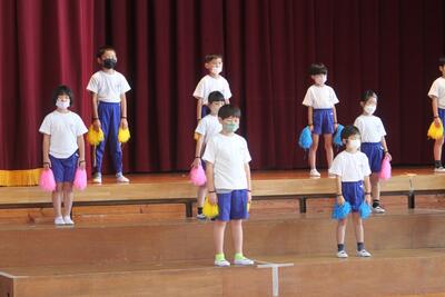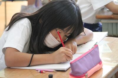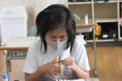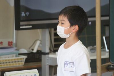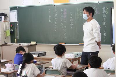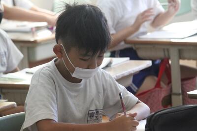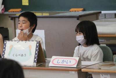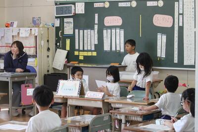 学級活動でハロウィンパーティーの話し合いをしている1年生。