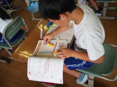 2年生は算数で「ながさをくらべる」学習です。ブロックを使いながら、長さを調べています。