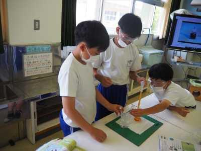 5年生は、家庭科「野菜のゆで方」についての学習です。葉ものと根菜に着目しながら、水からゆでるのか、沸騰してからゆでるのかを確かめていました。