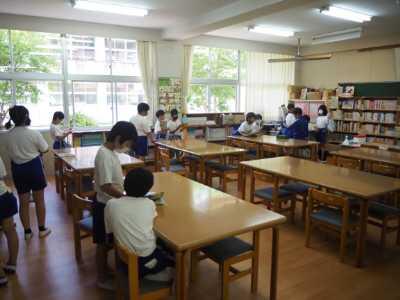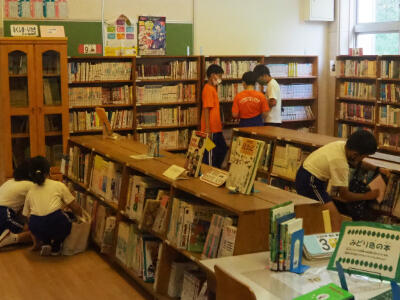 図書委員が本の返却、貸し出し作業を行っていました。本を返して、新しい本を借りるのに多くの児童が集まっていました。