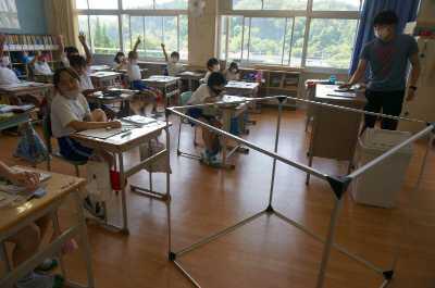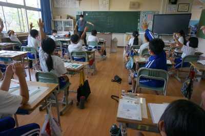 5年生は、算数の1㎥の授業です。1㎥に1c㎥がどれぐらい入るのかを予想しながら実際の大きさを確認していました。