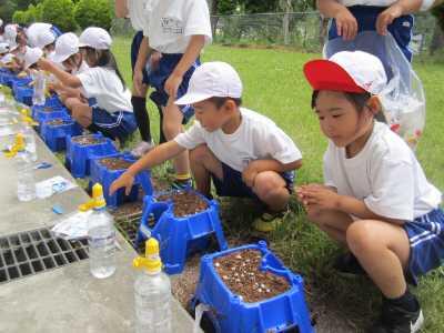 1年生は生活科で、あさがおの種まきをしていました。植木鉢に土を入れ、種をまきます。最後に、水やりです。一人一つの植木鉢、みんな大切にお世話してくれることでしょう。