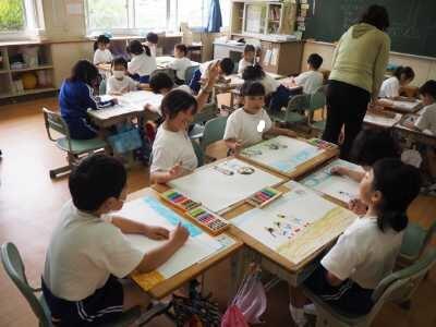 1年生の図工は「みて みて あのね」の学習です。自分が楽しかったことなどを思い思いにクレヨンで表していました。