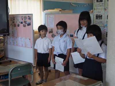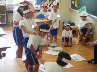2023年6月28日 14時15分1年生は国語の「大きなかぶ」の音読です。昨日は、グループごとに役割分担をして練習していたのですが、今日はそれそれの役が一目で分かるようにお面をかぶっての練習です。動きなども工夫しながら、その役になりきって音読していました。