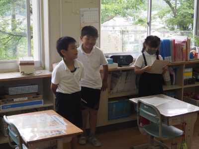 2年生は、まちたんけんの発表会の練習です。時間をはかりながらグループごとに発表の練習をしました。授業参観のときに発表会をします。