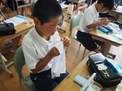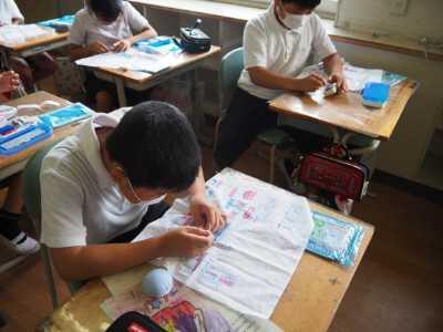 5年生の家庭科は、針の糸通し、玉結び、玉どめ、なみぬいの練習です。なかなか思うようにいかず苦戦する様子も見られましたが、みんな集中して頑張っていました。