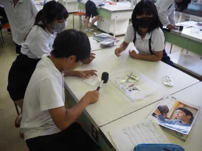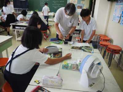 6年生は理科で植物の葉に日光が当たるとでんぷんができるかの実験です。今日は、実験の前段階。3つの条件のときの葉を使い、たたき染めをしていました。これから漂白で緑色の色素をぬいて、次の時間に実験です。どんな結果になるのか楽しみですね。