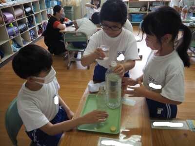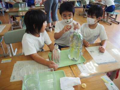 2023年7月4日 15時02分2年生は、算数のかさの学習です。1Lますや1dLますを使って、ペットボトル等のいろいろな容器の水のかさを調べていました。調べるペットボトルに水を入れて、こぼさないように慎重にますに移しかえています。かさはどれぐらいになったのでしょうか。