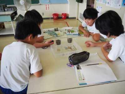 4年生の理科は、「雨水のゆくえと地面のようす」の学習です。はじめに校庭に出て、雨水ができやすい、できにくい場所を観察しました。その後、それぞれの場所の土によって水のしみ込み方は変わるのかを実験しました。ストップウォッチでどちらかがしみ込み方が早いのか熱心調べています。