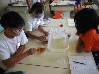 6年生の理科は、「植物に日光が当たるとでんぷんができるか」の実験です。日光の有無によって条件を変えたものにヨウ素液をひたして調べました。今回は、はっきり結果が出て、葉に日光が当たるとでんぷんがができることがよく分かったようです。