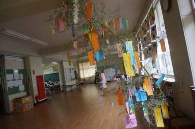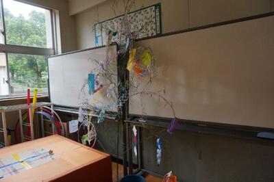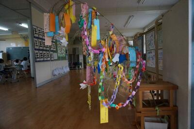 先週の授業参観前から、各ブロックのオープンスペースには、地域の方からいただいた竹に七夕飾りや願い事を書いた短冊を飾っていました。みんなの願い事がかなうといいですね。
