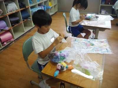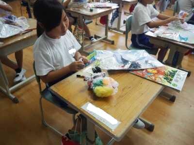 3年生の図工では「カラフルフレンド」の学習です。透明なビニール袋にお花紙や毛糸を入れてふわふわでカラフルな形になります。それを組み合わせることで、自分がイメージした友だちをつくることができました。