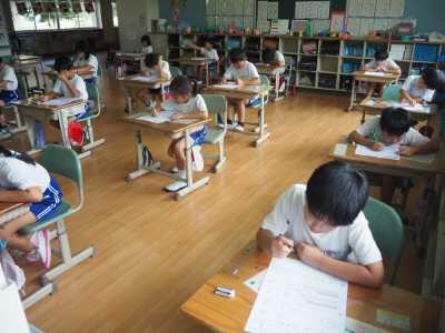2023年9月5日 14時20分2年生は、算数で夏休みの確認テストをしている場面です。学習したことを思い出しながら、みんな真剣に取り組んでいます。