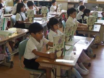 1年生は国語の「やくそく」の授業。教科書をきちんと持って本を読んでいる場面です。この後、「あおむしはどこにすんでなにをしているか」をめあてに、お話の内容をみんなで確認していました。