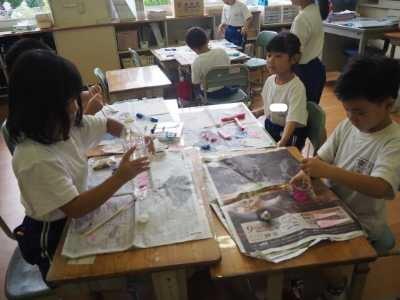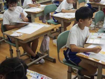 2年生は図工の時間。絵の具を使って、水あそびの絵をかいていました。水あそびをして楽しそうな様子を絵に表していました。