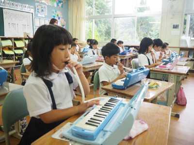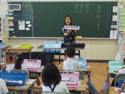 3校時目は、1年の音楽の授業です。鍵盤講習会ということで、根本様を講師に迎え、鍵盤ハーモニカの使い方や演奏の仕方(運指)について教えていただきました。歌に合わせながら、楽しく「ドレミファ」までの運指を学習することができました。根本様、ありがとうございました。