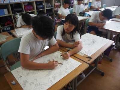 4年生の図工は、「まぼろしの花」という題材で、オリジナルの花をかいていました。お互いに見せ合い、「すごね!」という言葉が自然と出ていました。