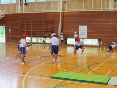 5年生は、体育のマット運動です。グループごとにマット運動に必要な様々な動きを練習しています。グループ内で動きを確かめながら取り組んでいました。