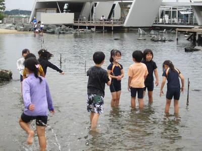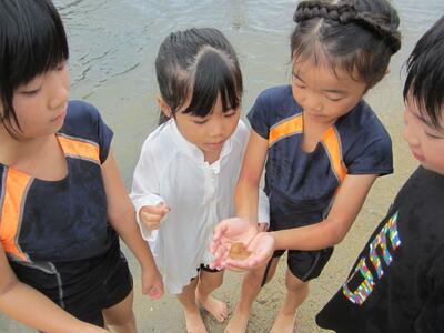 蛇の目ビーチで大はしゃぎ。たくさん貝殻を見つけました。クラゲやヒトデを見つけて、たくさん遊びました。