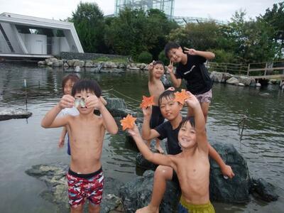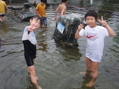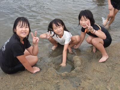 蛇の目ビーチでは、水に入ってとても気持ちよさそうです。ヒトデや貝などの生きものを触ったり、砂遊びを楽しんだりしました。