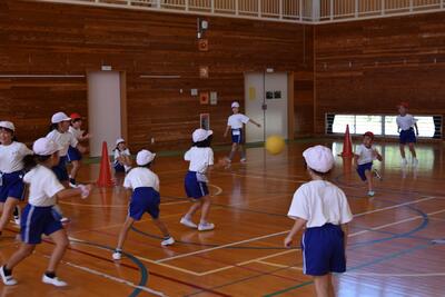 1年生は体育でドッジボールを楽しんでいました。ボールを遠くまで投げられるようになってきましたね。