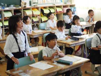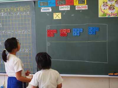 2023年10月3日 13時00分2年生は、算数でかけ算の式に表す学習です。5個ずつ4皿分と4個ずつ5皿分の式を説明する学習です。おはじきを使いながら説明することができました。