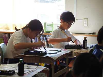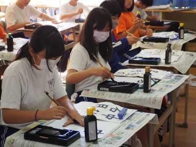 6年生は、書写の授業です。「中秋の名月」という文字をお手本をよく見て書いていました。5文字なので、文字のバランスや大きさに気をつけて書いていたようです。