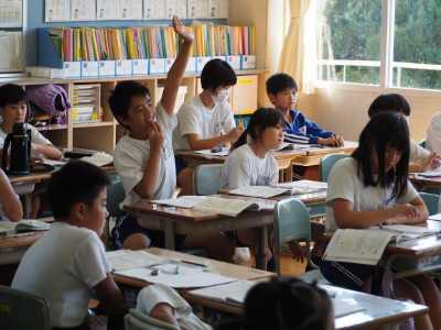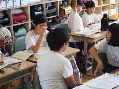 4年生は、算数のおよその数の使い方や表し方を調べる学習です。どのように概数にしたかを友達と説明し合うとともに、四捨五入の仕方について全員で確認していました。