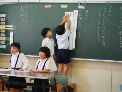 1年生は、学級活動で「ドッジボール大会のけいかくをたてよう」という議題で、どんなチームにするかなどを話し合っていました。司会や記録も子どもたちが挑戦しています。