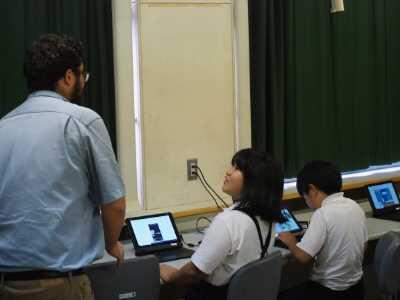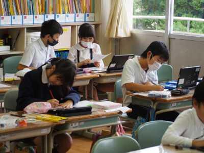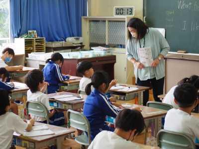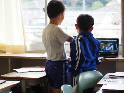 5年生の外国語科は、「身近な人のことを紹介する」学習です。スピーチするときに気をつけることを確認して、友達同士で紹介し合いました。タブレットを使ってスピーチの様子を記録して、振り返っていました。