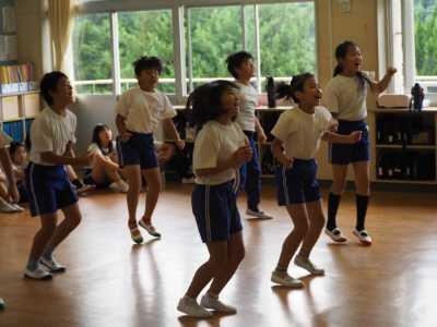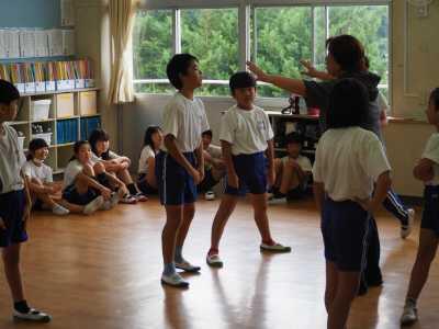 4年生は、学習発表会に向けてダンスの練習をしていました。振り付けを先生と一緒に確認しながら楽しそうに踊っています。かけ声もそろっています。