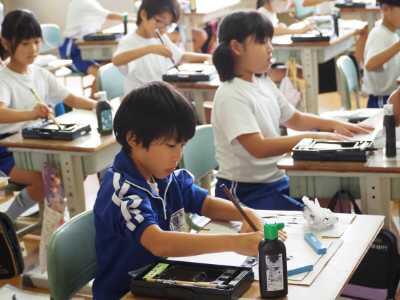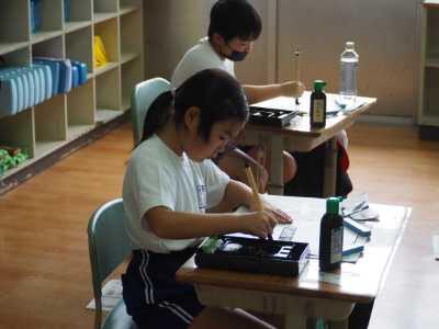 2023年10月5日 13時47分3年生は書写の時間です。「大」の左はらい、右はらいに気をつけて書くことがめあてです。手本をよく見ながら一画一画丁寧に書いていました。