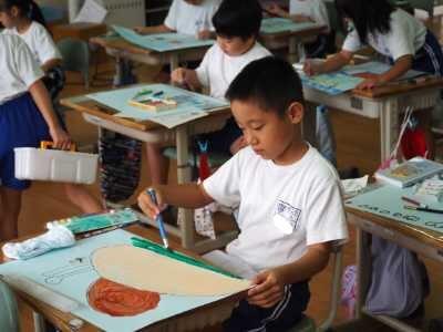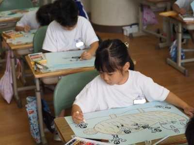 1年生は図工の時間です。「のってみたいな いきたいな」ということで、自分が乗りたいものや行きたいところを想像しながら画用紙にかいていました。みなさんの思いがたくさんつまっています。