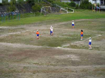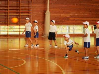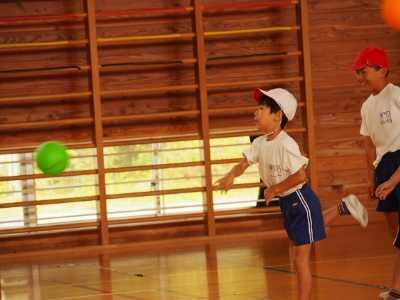 2年生は体育のボール投げ遊びの学習です。いろいろな距離においた的を目がけて投げています。楽しみながらボール遊びをしていました。