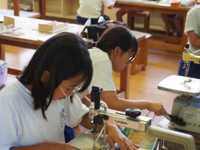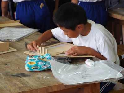 5年生は図工の授業です。電動糸のこの使い方もだいぶ上手になりました。切ったパーツを繋ぎ合わせたり色をつけたりしてビー玉の迷路を作っていました。