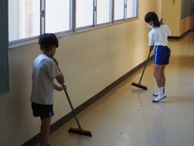2023年10月6日 12時29分今日は風が強く、保健室の前の廊下には窓から入ってきた落ち葉や砂などが落ちていました。その前を通りかかった3年生の2名の児童が進んでほうきを持ってきて掃除をしていました。このような姿がとても立派です。