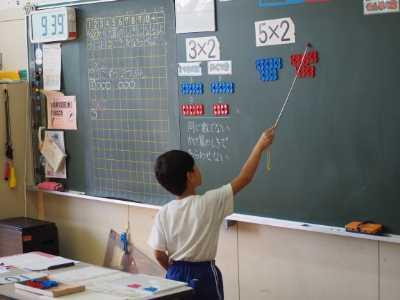 2年生の2校時目は算数の授業でした。先生方の研修を兼ねていたため、多くの先生方も授業を参観しました。授業では、かけ算の式を言葉の式に表して、それをおはじきで表す学習を行いました。