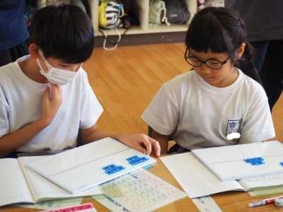 子どもたちの感想からは、5×2、2×5の答えは同じだけど、言葉の式やおはじきで表したことで意味が違うことが分かったと書いている児童もおり、しっかりかけ算の意味を理解することができたようです。