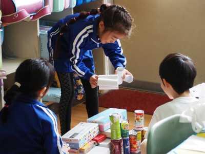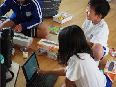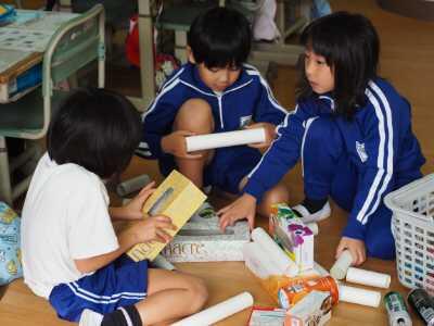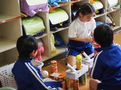 2023年11月13日 14時46分1年生は、算数のかたちあそびの学習です。身の回りのものを使って、つくることがめあてです。テープは使いません。班のメンバーで四角やまるのものをつみあげるなどして、乗り物やたてものなどを作っていました。みんなとても楽しそうに活動している姿が印象的でした。