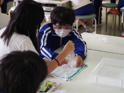 5年生は理科の「もののとけ方」の学習です。砂糖や片栗粉などを水に溶かし、溶け方を調べていました。見た目は似ているけど、溶け方は違うようです。