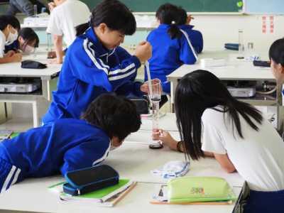 その後、食塩とミョウバンが50mlの水にどれぐらい溶けるのかをそれぞれ調べました。溶け残りが出るまで溶かし続けます。班で協力しながら溶かし続けました。食塩とミョウバンでは溶け方には違いがあったようです。