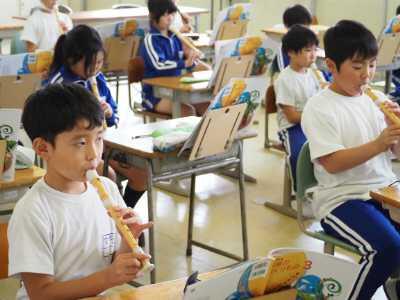 3年生は、音楽の時間。せんりつの流れとへん化で「レッツゴーソーレー!」をリコーダーで演奏していました。4月から始めたリコーダーもかなり上達しました。