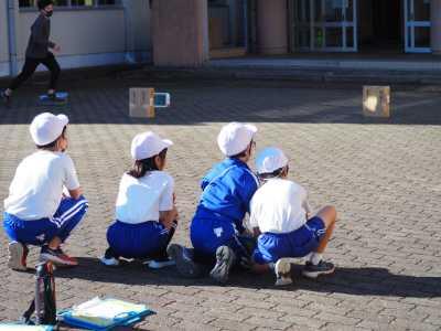 3年生の理科は、はね返した日光が当たった部分の温度や明るさはどうなるかの学習です。段ボールで作った箱に温度計をつけて、はね返した日光を当てます。安全に気をつけながら、グループで協力して温度や明るさを調べていました。