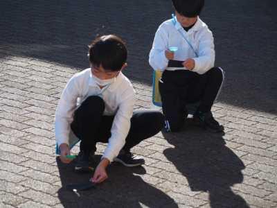 午後は、日光を集めるとどうなるかを虫めがねと黒い紙を使って調べました。煙が出て、紙がこげる様子に子どもたちは驚いていました。