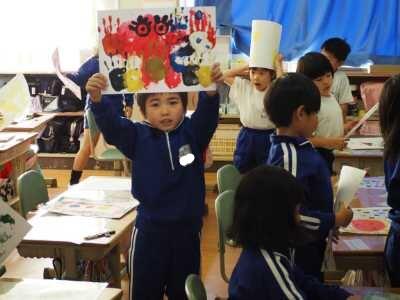 1年生は図工の「ぺったん コロコロ」です。スタンプや手型などを使って完成させました。どれもすてきな作品です。作品をうれしそうに見せてくれました。