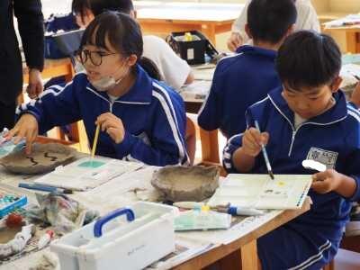 5年生は、図工の「使って楽しい焼き物」の題材です。今日は自分が工夫して作った器に絵の具で色づけをしていました。完成が待ち遠しいです。