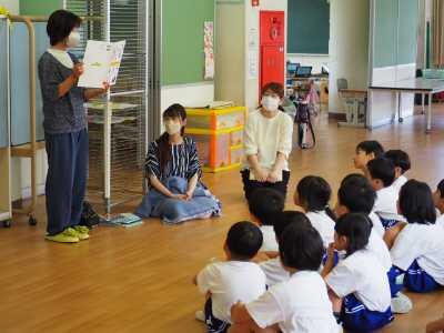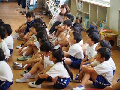 図書ボランティアの皆さんに「ぐりとぐら」「はるのやまはザワザワ」「一ねんせいになったら」の3冊を読んでいただきました。子どもたちの表情からお話の世界に引き込まれているように感じました。「一ねんせいになったら」では、みんなで歌いながら絵本を見ていました。