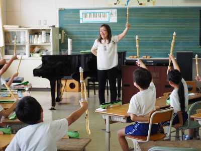 最後に講師の先生からいろいろな大きさのリコーダーを教えてもらい、その楽器の特徴に合った曲を演奏していただきました。子どもたちは、楽器の大きさとその音の違いにびっくりしていました。